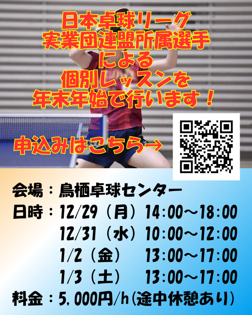 (日本卓球リーグ実業団連盟所属選手)岡本彩里による個別レッスンを年末年始で行います!